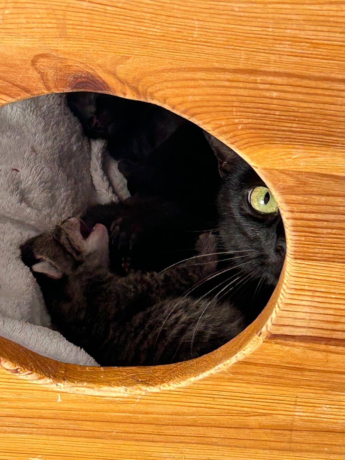 Im April 2025 kam Liza zu uns – hochschwanger und voller Angst. Kurz darauf brachte sie sieben wundervolle Babys zur Welt. Trotz ihrer eigenen Unsicherheit hat sie sich rührend um ihre Kleinen gekümmert, sie liebevoll versorgt und großgezogen, bis wir für jedes einzelne Kitten ein schönes Zuhause finden konnten. 💛